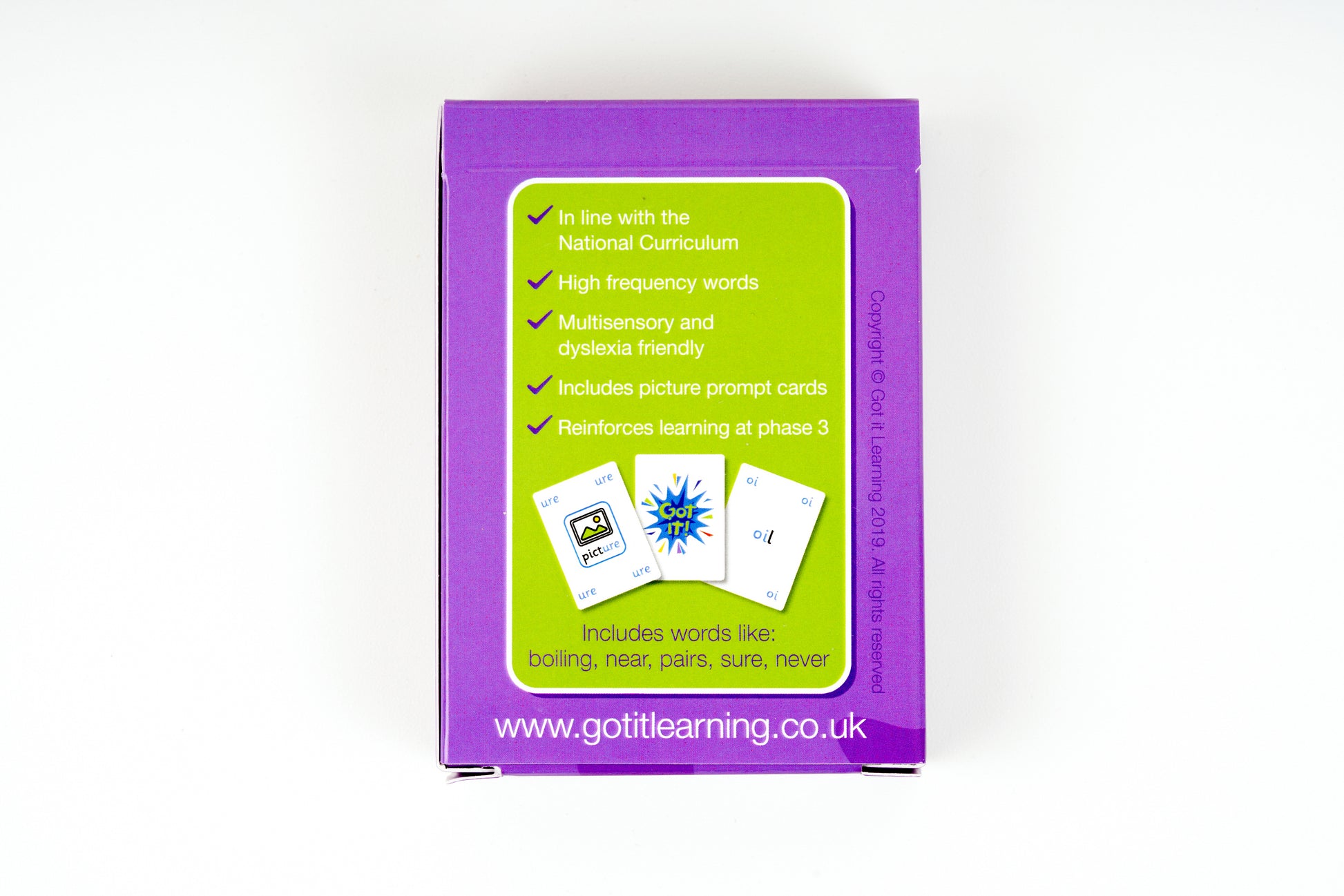 In each pack of Got it cards there are five, fun phonic reading and spelling games which are : Word Race, Word Pairs, Word Match, Word Sets and Word Switch. Players will have so much fun, they will learn how to read and spell without even realising.Got it games are designed by an experienced teacher. Using a multi-sensory approach to identify the sounds in words will create the building blocks to independently read and spell important high frequency words. The Picture Prompt cards help link the sound to the picture, supporting independent learning. Simple, clear font with focus sounds in blue. The Got it cards act as joker cards, giving all players a chance to win right up to the end. These cards ensure that every player maintains engagement.