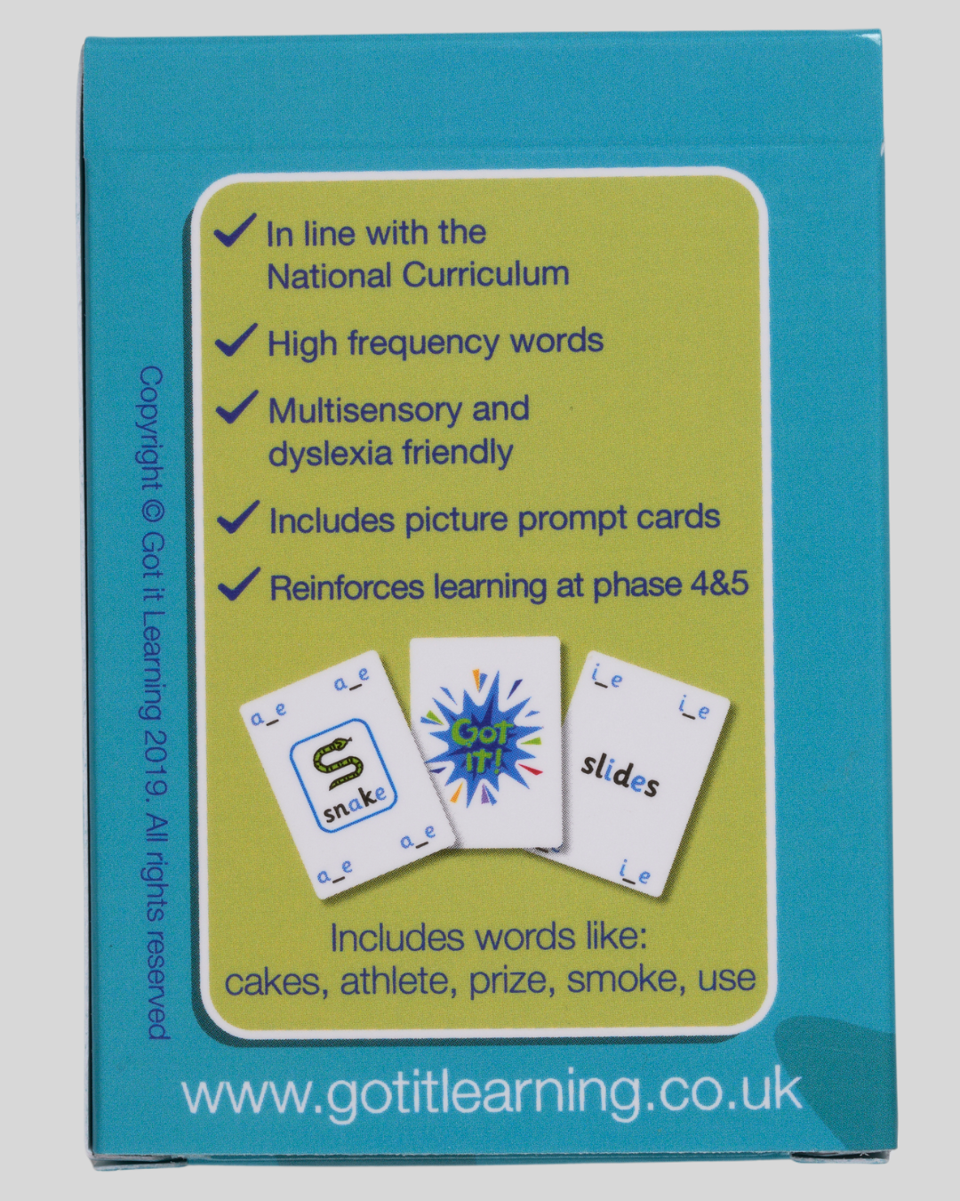 In each pack of Got it cards there are five, fun phonic reading and spelling games which are : Word Race, Word Pairs, Word Match, Word Sets and Word Switch. Players will have so much fun, they will learn how to read and spell without even realising.Got it games are designed by an experienced teacher. Using a multi-sensory approach to identify the sounds in words will create the building blocks to independently read and spell important high frequency words. The Picture Prompt cards help link the sound to the picture, supporting independent learning. Simple, clear font with focus sounds in blue. The Got it cards act as joker cards, giving all players a chance to win right up to the end. These cards ensure that every player maintains engagement.