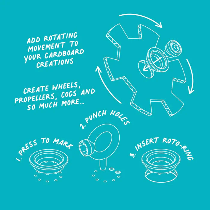 The Makedo Roto-Ring brings wheels, propellers, sliding doors, drawbridges and more to your cardboard builds. Made from 100% recycled materials, it adds a smooth rotating and sliding motion to your creations.