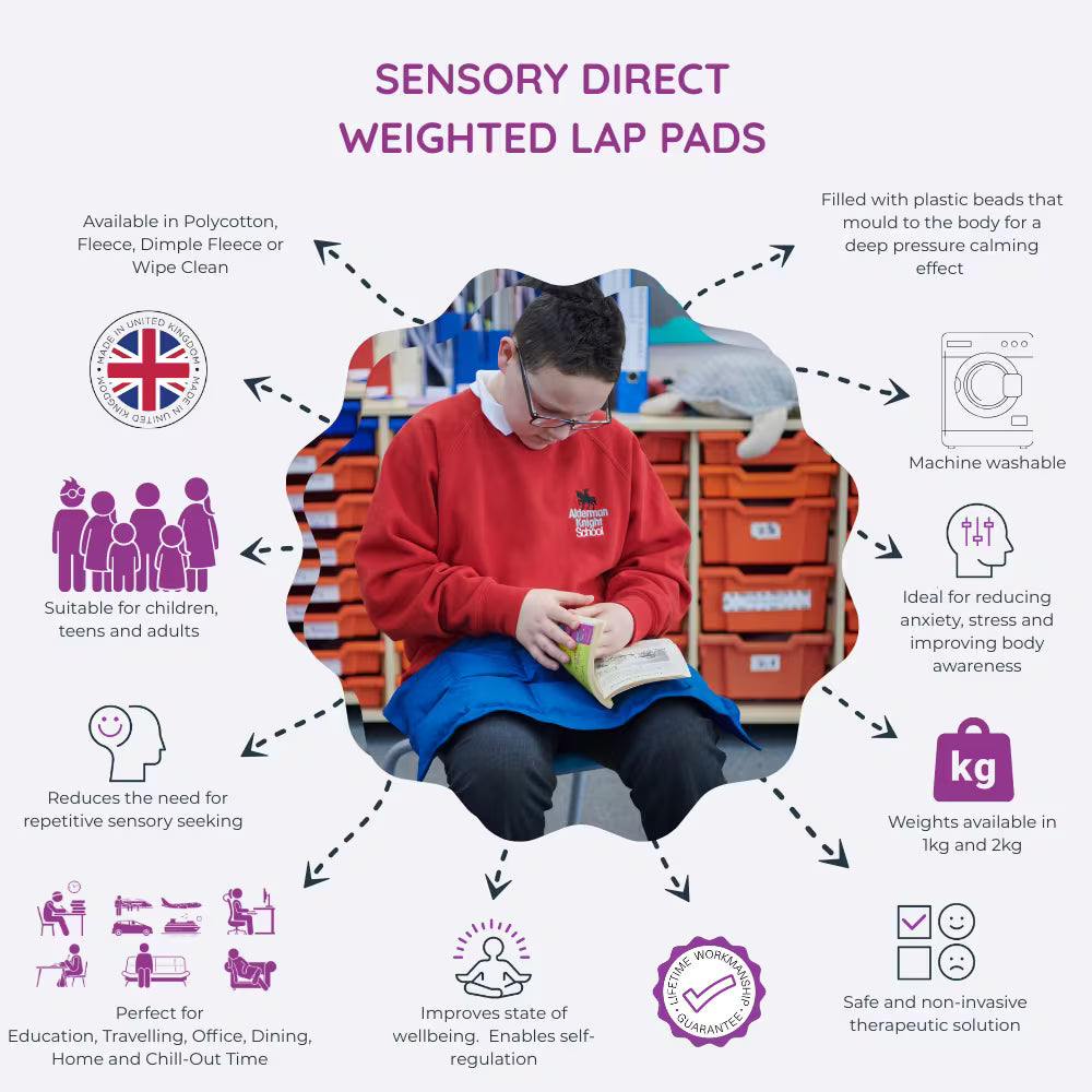 Sensory Direct's Polycotton Weighted Lap Pads are designed to apply calming deep pressure to the lap, upper legs, hips or pelvis whilst the user is sitting down. The weight is provided by plastic beads sewn into small individual cells that mould themselves to the body or legs.
